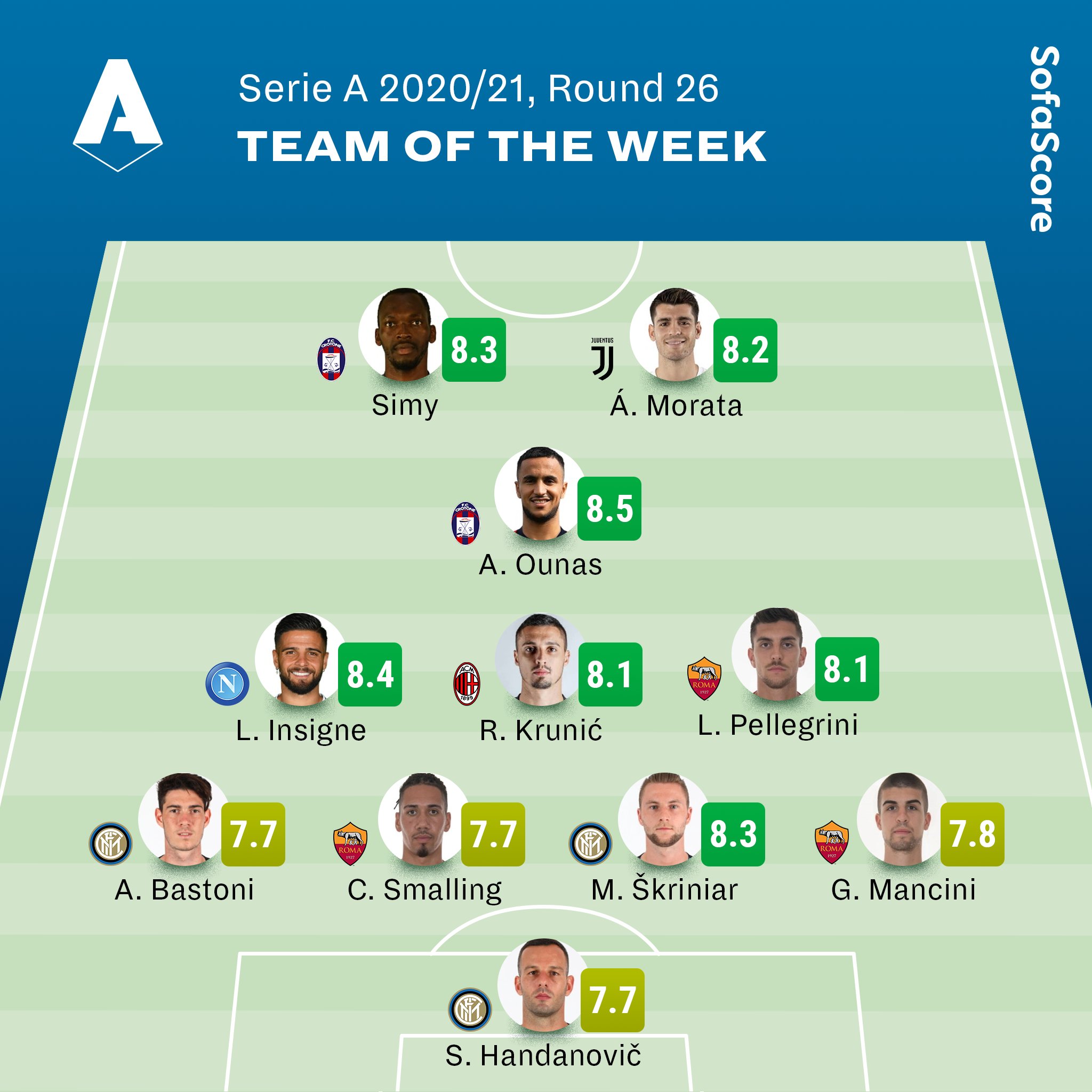 Sofascore On Twitter Team Of The Week Serie A S Round 26 Finished Yesterday So It S Time For Our Newest Totw Inter And Roma Lead The Way With 3 Players Each While Crotone S Adam Ounas Earns Our Player Of The Week Award After His Impressive